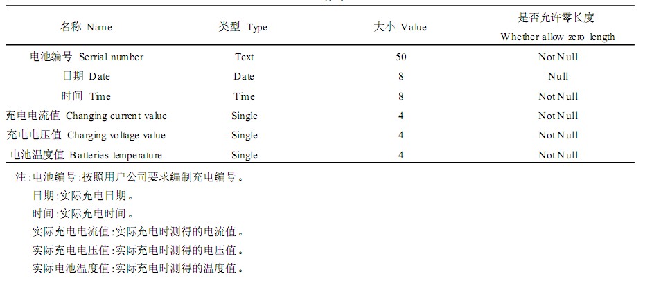 本系統(tǒng)設(shè)計了三個數(shù)據(jù)庫,用于標(biāo)準(zhǔn)充電曲線存儲、實(shí)際充電曲線存儲及分析結(jié)果存儲。使用VB6. 0提供的數(shù)據(jù)庫管理工具"可視化數(shù)據(jù)管理器"建立。其中實(shí)際充電曲線數(shù)據(jù)表如表1所示,數(shù)據(jù)庫的建立方便了對電池的查詢、分析,同時也方便了管理。