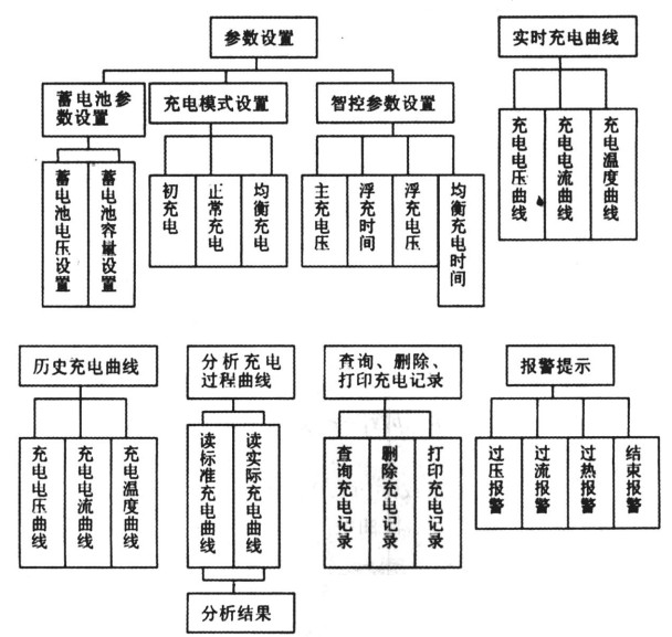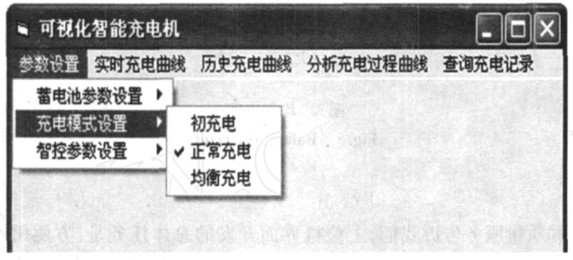在參數(shù)設(shè)置中可以對框圖中所示的條目進(jìn)行設(shè)置,使得該系統(tǒng)具有很強(qiáng)的通用性。電動車電池一般由幾個單體組合而成,可以選擇單體個數(shù)以確定電池組的電壓和容量。該系統(tǒng)提供了如框圖所示的三種充電模式,一般新電池前五次充電要進(jìn)行初充電以充分激活電解質(zhì),當(dāng)單體電量不同時要均衡充電,其余時正常充電。還可以按照需求設(shè)置不同充電階段的充電時間,來滿足各種電池的不同需求;實(shí)時充電曲線實(shí)時地顯示充電電流、電壓和電池溫度;歷史充電曲線可以顯示該電池組充電歷史;通過分析充電過程曲線即可了解電池存在的問題,如:蓄電池缺乏電解液、電解液比重不符合要求或蓄電池單體存在差異等,從而及時的對電池進(jìn)行保養(yǎng);該系統(tǒng)還提供了按日期或電池編號查詢、刪除充電記錄的數(shù)據(jù)庫功能,方便了操作;報警提示用來告知用戶充電的過壓、過流、過熱情況以及充電是否結(jié)束。