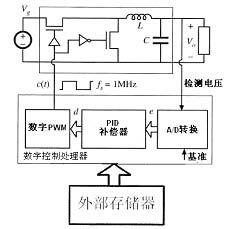 隨著數(shù)字芯片和電源技術(shù)的發(fā)展,現(xiàn)在出現(xiàn)了為電源控制而開發(fā)出來(lái)的控制處理器,它不同于數(shù)字芯片的中央處理器??刂铺幚砥髦饕筛咚貯D轉(zhuǎn)換器,數(shù)字PID補(bǔ)償器和數(shù)字PWM輸出三部分組成。反饋環(huán)路的控制由它來(lái)完成,中央處理器作為管理模塊應(yīng)用在電源上。其原理圖如圖3所示: