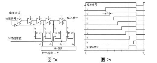 控制處理器由高速A/D轉(zhuǎn)換器,數(shù)字PID補(bǔ)償器和數(shù)字DPWM輸出組成。外部存儲(chǔ)器記錄了控制處理器的相關(guān)程序。高速A/D轉(zhuǎn)換器是基于CMOS的傳輸延遲時(shí)間td 影響輸入電壓VDD的原理做成的,VDD電壓和傳輸時(shí)間是成近似的反比例關(guān)系,即VDD越大,信號(hào)傳輸延遲時(shí)間越小。如圖2所示,以CMOS的輸入電壓VDD作位采樣電壓的輸入口,各信號(hào)之間的傳輸時(shí)間延時(shí)td受采樣電壓VDD影響。第四分之三個(gè)采樣周期過(guò)后采樣結(jié)束位產(chǎn)生高電平,開始記錄q1到q8的輸出,把得到的結(jié)果送入編碼器得到數(shù)字輸出e,完成A/D轉(zhuǎn)換。如圖2b所示,數(shù)字采樣值為11111100.VDD越大,td越小得到的采樣值越大。