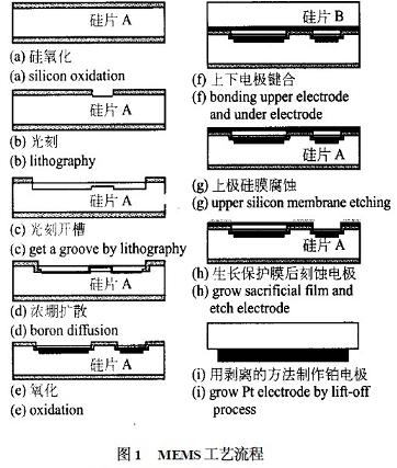 硅電容式壓力傳感器的敏感元件是半導(dǎo)體薄膜,它可以由單晶硅、多晶硅等利用半導(dǎo)體工藝制作而成。典型的電容式傳感器由上下電極、絕緣體和襯底構(gòu)成。當(dāng)薄膜受壓力作用時,薄膜會發(fā)生一定的變形,因此,上下電極之間的距離發(fā)生一定的變化,從而使電容發(fā)生變化。但電容式壓力傳感器的電容與上下電極之間的距離的關(guān)系是非線性關(guān)系,因此,要用具有補償功能的測量電路對輸出電容進行非線性補償。由于高溫壓力傳感器工作在高溫環(huán)境下,補償電路會受到環(huán)境溫度的影響,從而產(chǎn)生較大的誤差。基于模型識別的高溫壓力傳感器,正是為了避免補償電路在高溫環(huán)境下工作產(chǎn)生較大誤差而設(shè)計的,其設(shè)計方案是把傳感器件與放大電路分離,通過模型識別來得到所測環(huán)境的壓力。高溫工作區(qū)溫度可達350℃。傳感器件由鉑電阻和電容式壓力傳感器構(gòu)成。其MEMS工藝如下: