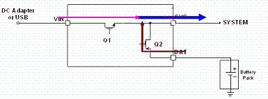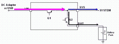 LD6275 具有適應(yīng)性電源路徑管理(Adaptable Power Path Management, APPM)功能,其為以供給系統(tǒng)端用電為主,對電池充電為輔,如圖3所示;當系統(tǒng)用電超過輸入電源的供給限制時,其電池亦能主動開啟放電功能同時對系統(tǒng)端供給其所需之電能需求,如圖4所示。