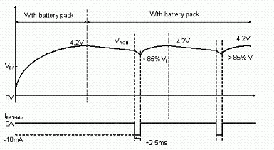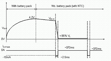 使用者亦有可能在充電或式充電完畢后,在未將電源移除的情況下,即抽離電池的情況。為避免造成危險,IC內(nèi)部應(yīng)具有如圖7, 8的電池存在偵測機制。充電IC會以短時間脈沖(每370ms產(chǎn)生2ms的脈沖)方式抽取電池電流,此時若電池存在,則偵測到的電池電壓應(yīng)大于一預(yù)設(shè)閥值;若電池已切離,則充電IC偵測到一低電壓,即可判定為電池斷開狀態(tài),并將電池端電壓切斷,保護使用者安全。