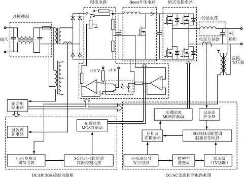 圖1示出了系統(tǒng)主電路和控制電路框圖。交流輸入電壓經(jīng)過(guò)共模抑制環(huán)節(jié)后,再經(jīng)工頻變壓器降壓,然后整流得到一個(gè)直流電壓,此電壓經(jīng)過(guò)Boost電路進(jìn)行升壓,在直流環(huán)上得到一個(gè)符合要求的直流電壓350V(50Hz/220V交流輸出時(shí))。DC/AC變換采用全橋變換電路。為保證系統(tǒng)可靠運(yùn)行,防止主電路對(duì)控制電路的干擾,采用主、控電路完全隔離的方法,即驅(qū)動(dòng)信號(hào)用光耦隔離,反饋信號(hào)用變壓器隔離,輔助電源用變壓器隔離。過(guò)流保護(hù)電路采用電流互感器作為電流檢測(cè)元件,其具有足夠快的響應(yīng)速度,能夠在MOS管允許的過(guò)流時(shí)間內(nèi)將其關(guān)斷。