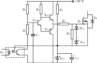 設(shè)計(jì)的驅(qū)動(dòng)電路如圖5所示,它由驅(qū)動(dòng)脈沖放大和5V基準(zhǔn)兩部分組成。脈沖放大包括光耦Vo1,R1和R2,中間級(jí)的VT1,推挽輸出電路VT2和VT3,對(duì)高頻干擾信號(hào)進(jìn)行濾波的C1;5V基準(zhǔn)部分包括R4,VZ1和C2,它既為MOS管提供-5V的偏置電壓,又為輸入光耦提供副邊電源。其工作原理是: