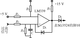 過(guò)流保護(hù)是利用SG3524的腳10加高電平封鎖脈沖輸出的功能。當(dāng)腳10為高電平時(shí),SG3524的腳11及腳14上輸出的脈寬調(diào)制脈沖就會(huì)立即消失而成為零。過(guò)流信號(hào)取自電流互感器(對(duì)SG3524-1芯片串接在工頻變壓器的副邊,對(duì)SG3524-2芯片串接在濾波電路前),經(jīng)整流后得到電流信號(hào)加至如圖6所示過(guò)流保護(hù)電路上。過(guò)流信號(hào)加至電壓比較器LM339的同相端。當(dāng)過(guò)流信號(hào)使同相端電平比反相端參考電平高時(shí),比較器將輸出高電平,則二極管D2將從原來(lái)的反向偏置狀態(tài)轉(zhuǎn)變?yōu)檎驅(qū)?,并把同相端電位提升為高電平,這一變化將使得電壓比較器一直穩(wěn)定輸出高電平封鎖脈沖,則Boost電路停止工作,在正常狀態(tài)下,比較器輸出零電平,不影響B(tài)oost電路工作。