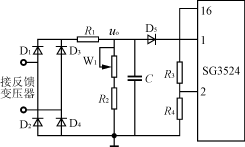 反饋調(diào)壓電路圖如圖7所示。當(dāng)逆變器正常工作時(shí),逆變器的輸出信號(hào)接反饋?zhàn)儔浩?,其二次電壓?jīng)整流,濾波,分壓得到反饋電壓uo,顯然,uo的大小正比于逆變器的輸出電壓。調(diào)節(jié)W1可調(diào)節(jié)負(fù)反饋電壓的大小,從而調(diào)節(jié)逆變器輸出電壓的幅值。uo控制信號(hào)被送到SG3524-1芯片的誤差放大器的反相端腳1。誤差放大器的同相端腳2接參考電平。這樣,SG3524的輸出脈沖的占空比就受到反饋信號(hào)的控制。調(diào)節(jié)過(guò)程是這樣的,當(dāng)逆變器輸出因突加負(fù)載而降低時(shí),它會(huì)使加在SG3524-1的腳1的輸入反饋電壓下降,這會(huì)導(dǎo)致SG3524-1輸出脈沖占空比增加,從而使得Boost電路輸出電壓升高,逆變橋的直流電壓升高,逆變器輸出交流電壓升高。反之亦然??梢?,正是通過(guò)SG3524-1的脈寬調(diào)制組件的控制作用,實(shí)現(xiàn)了整個(gè)逆變器的輸出自動(dòng)穩(wěn)壓調(diào)節(jié)功能。