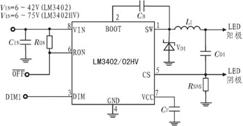 高亮度白光二極管一般采用恒流電源驅(qū)動(dòng)。因?yàn)殡S著LED逐漸變熱,其電壓降將減小,而且若LED串由恒壓電源供電的話,電源往往會(huì)持續(xù)提供過多的電流,使輸出電壓增大,直到電源達(dá)到電流限值或LED失效。脈寬調(diào)制方式是用較高的頻率開關(guān)LED,開關(guān)頻率超出人一般能夠察覺的范圍,給人一種LED總亮的假象,現(xiàn)在普遍采用脈寬調(diào)制方式調(diào)節(jié)LED的亮度,在某些應(yīng)用中,調(diào)光比可達(dá)5 000:1,常用的LED驅(qū)動(dòng)有降壓型(Buck)、升壓型(Boost)、升降壓型(Buck~Boost)等3種。LM3402是一款由可控電流源衍生的降壓型穩(wěn)壓器,輸入電壓范圍涵蓋整個(gè)汽車應(yīng)用領(lǐng)域,內(nèi)置MOS管最多可以驅(qū)動(dòng)5顆LED,性價(jià)比高,且接受領(lǐng)域較廣、線路簡潔實(shí)用,是眾多LED驅(qū)動(dòng)IC中間的佼佼者。