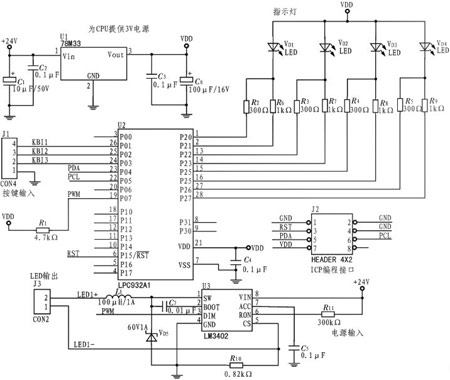 P89LPC932是由飛利浦生產(chǎn)的低功耗單片微處理器,電源電壓3.3V,可低功耗運(yùn)行,適合于許多要求高集成度、低成本的場合??梢詽M足多方面的性能要求。P89LPC932采用了高性能的處理器結(jié)構(gòu),指令執(zhí)行時(shí)間只需2~4個(gè)時(shí)鐘周期,6倍于標(biāo)準(zhǔn)80C51器件。P89LPC932集成了許多系統(tǒng)級(jí)的功能,這樣可大大減少元件的數(shù)目、電路板的面積以及系統(tǒng)的成本,其內(nèi)部有2個(gè)定時(shí)器,可作為一個(gè)具有256個(gè)定時(shí)器時(shí)鐘周期的PWM發(fā)生器使用。LED調(diào)光電路電氣原理圖如圖2所示。
