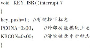 經(jīng)檢測,在同等照度要求的情況下,采用LED調(diào)光控制系統(tǒng)的功耗較白熾燈降低90%以上,當(dāng)然為進(jìn)一步降低能耗,節(jié)能方法的探究仍然具有十分重要的意義。在多數(shù)時(shí)間,HBLEDs可能處于熄滅狀態(tài),若控制系統(tǒng)處于待機(jī)狀態(tài)或掉電狀態(tài),可將功耗降低到最低;或?qū)FF端口接地,也可將LM3402置于一個(gè)極低的低功率關(guān)機(jī)狀態(tài)。將微處理器P89LPC932的電源控制寄存器PCONA設(shè)置為0xFF時(shí),外部功能模塊掉電;將電源控制寄存器PCON設(shè)置為03H時(shí),可將微處理器處于完全掉電狀態(tài),只有在中斷觸發(fā)的時(shí)候,才能喚醒,隨即給外部功能模塊上電,微處理器開始工作。微處理器主要通過鍵盤中斷喚醒,鍵盤中斷參考程序如下: