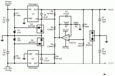 所有其他組件一般都是為了支持LDO,例如:輸入和輸出電容以及反饋電阻。所示LDO可支持±36V范圍的輸入電壓,但由于TLE2141運(yùn)算放大器的建議電壓極限,該電路的輸入電壓降低至±22V。可以選擇更高電壓的運(yùn)算放大器,以覆蓋LDO完整的±36V輸入范圍。