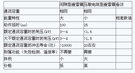 表1是不同類型的避雷器在同等測(cè)試波形(10/350μs)條件和相同的通流容量下的性能比較: