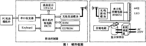 硬件系統(tǒng)主要有移動控制器和顯示屏兩部分組成,如圖1所示。移動控制器主要負責接收PC機端軟件取摸數(shù)據(jù)、加入控制字符并保存,還能向顯示屏發(fā)送特定控制命令、切換顯示內容、改變顯示效果。顯示屏主要有電機控制轉速和單片機控制E3jLED顯示內容等。