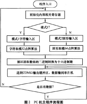 軟件采用實時的方式取模:數(shù)據(jù)圖形—數(shù)據(jù)。通過引入圖形這個中間量,使得提取字模變得靈活,無論任何字體、符號,都可以實現(xiàn)即時轉換。Pc機軟件主程序流程圖見圖2。