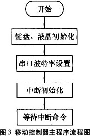 程序上電初始化后,處于等待狀態(tài)。當串口中斷一來I臨,優(yōu)先處理串口中斷.發(fā)送無線數(shù)據(jù)是通過鍵盤、菜單控制。移動控制器主程序流程圖見圖3;無線發(fā)送子程序見圖4。