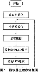 由單片機控制LED的亮滅和無線數(shù)據(jù)的接收.數(shù)據(jù)通過無線模塊接收后,單片機的串行接口收到數(shù)據(jù)并傳到主控芯片AT89S8252中處理,當有無線數(shù)據(jù)傳到時,優(yōu)先處理接收數(shù)據(jù).顯示屏主程序流程圖見圖5。無線數(shù)據(jù)接收子程序流程圖見圖6。顯示屏能否清晰顯示內容主要從以下幾方面考慮:1)單片機控制LED的亮滅時間:T=S/V,S為LED面寬度,為電機轉動線速度;2)電機轉動時軸心保持平衡;3)環(huán)境光線對比度。
