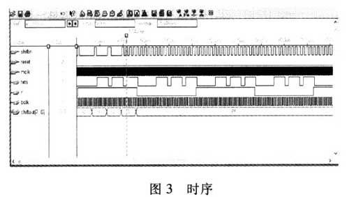 筆者用MaxPlus II對以上設(shè)計(jì)進(jìn)行仿真后得到圖3所示的時序圖,完全滿足設(shè)計(jì)要求,從圖3可以看出串行輸入的數(shù)據(jù)(shiflin)變成并行的數(shù)據(jù)(shiftout) 輸出,在此過程中數(shù)據(jù)延時8個周期,每個txts的上升沿提取數(shù)據(jù)能保證數(shù)據(jù)的正確性。因?yàn)閺臄?shù)據(jù)的變動到txts的上升沿有400ns,大于FPGA的數(shù)據(jù)建立時間(25ns~50ns),可以保證提取數(shù)據(jù)的正確性。