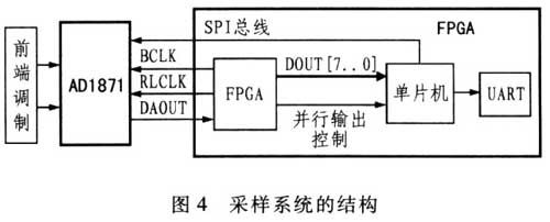 圖4示出采用ADl871構(gòu)成的采樣系統(tǒng)結(jié)構(gòu)。整個系統(tǒng)在1個FPGA上實(shí)現(xiàn),分為3部分:并轉(zhuǎn)換模塊;ADC控制和配置;UART通信。