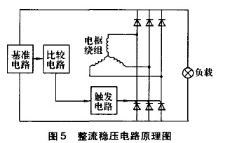 設(shè)計(jì)的釹鐵硼永磁發(fā)電裝置結(jié)構(gòu)示意圖如圖4所示,還研制了三相半控橋整流穩(wěn)壓電路(圖5)。該電路由三相半控橋整流電路、電壓信號取樣電路和觸發(fā)電路組成。當(dāng)發(fā)電機(jī)輸出電壓低于目標(biāo)穩(wěn)壓值時(shí),電子穩(wěn)壓器為三相整流輸出。當(dāng)發(fā)電機(jī)輸出電壓高于目標(biāo)穩(wěn)壓值時(shí),電壓信號取樣電路自動使三相半控橋整流電路瞬時(shí)斷開,降低輸出電醫(yī)當(dāng)發(fā)電機(jī)輸出電壓再低于目標(biāo)穩(wěn)壓值時(shí),三相半控橋整流電路再恢復(fù)工作,周而復(fù)始。通過整流、斬波,保證了發(fā)電機(jī)輸出電壓穩(wěn)定的直流電。