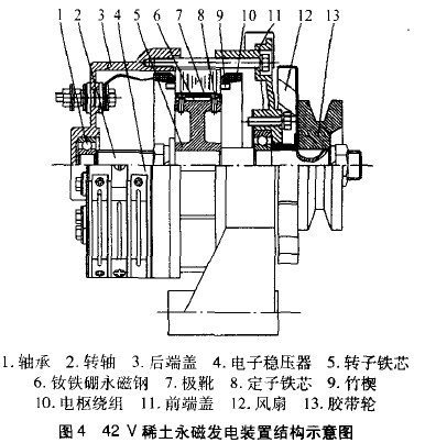 目前稀土永磁材料已經(jīng)具備了較高的性價(jià)比,現(xiàn)代電力電子技術(shù)也為研制出斬波式的電子穩(wěn)壓器奠定了基礎(chǔ)。因此,利用稀土永磁材料和現(xiàn)代電力電子元件研制出結(jié)構(gòu)簡單、發(fā)電效率高、壽命長的42V稀土永磁發(fā)電機(jī)具有較高的研究價(jià)值和廣闊的推廣前景。