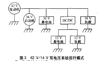 雙電壓系統(tǒng)對現(xiàn)有汽車零部件商的沖擊較小,因此汽車業(yè)傾向于這種方案。如圖3所示的雙電壓系統(tǒng),需要有一個DC/DC轉(zhuǎn)換器將42V電壓轉(zhuǎn)換成l4V電壓,因而需要2個蓄電池(12V和36V)。而只有當(dāng)大量的部件都適應(yīng)42V車用電源的時(shí)候,才能大批量生產(chǎn)純42V的車用電源。