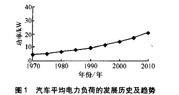汽車電源的電壓從上世紀(jì)50年代的6V改為12V,己有50多年的歷史。自1990年開始,汽車用電量每年以5%~8%的比例增加,其平均電力負(fù)荷的發(fā)展歷史與趨勢見圖1。隨著汽車技術(shù)的不斷進(jìn)步,將會有越來越多的電氣及電子系統(tǒng)被應(yīng)用到汽車上。