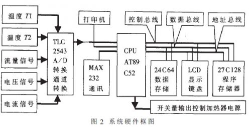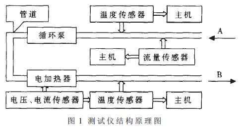 本儀器由流量傳感器、電流傳感器、電壓傳感器、溫度傳感器、泵、電加熱器;管道和主機等緩?fù)Y(jié)構(gòu)面匡如圖1所示。