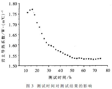 測試時間對測試結(jié)果的影響如圖3所示。由圖3可以看出,測試時間不同,計算出的鉆孔周圍地下巖土的平均導(dǎo)熱系數(shù)也不同。當(dāng)測試時間達(dá)到約50小時后,測出的導(dǎo)熱系數(shù)趨于穩(wěn)定,維持在1.530~1.538 W/m℃的范圍之間。通常測試時間可以選取60小時左右,這樣既可以保證獲得正確的導(dǎo)熱系數(shù),又可以避免測試時間過長。