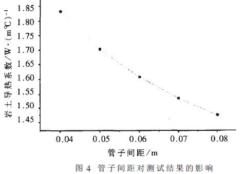 維持其它條件不變,只改變導(dǎo)管上升管與下降管之間的間距,其對巖土導(dǎo)熱系數(shù)的影響見圖4。當(dāng)管間距變化約為0.0lm時.計算出的導(dǎo)熱系數(shù)變化約為4~8%。由圖中可以看出,間距越大,計算出的導(dǎo)熱系數(shù)越?。哼@是由于間距越大,鉆孔內(nèi)的熱阻越小,在總熱阻不變的情況下.周圍巖土的導(dǎo)熱熱阻大。即導(dǎo)熱系數(shù)小。因此如何確定管于間距是設(shè)計地源熱泵系統(tǒng)中值得認(rèn)真探討的問題。