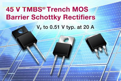 Vishay發(fā)布12個采用不同封裝的45V TMBS® TrenchMOS勢壘肖特基整流器器件可用于光伏太陽能電池旁路保護,具有10A~40A的寬額定電流范圍,在20A電流下的典型VF低至0.51V。