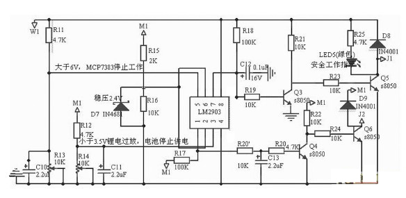 過電壓保護(hù)控制,具體電路如圖3所示:整流二極管D4 接過電壓保護(hù)繼電器JDQ1輸出。 充電控制管理芯片MCP73831最大輸入電壓為6V. 雖然供電網(wǎng)絡(luò)基本輸出電壓為5V,但當(dāng)光照強(qiáng)度發(fā)生劇烈變化或負(fù)載變化較大時(shí),輸出電壓仍然會(huì)有一定波動(dòng),為保護(hù)MCP73831不因短時(shí)的電壓波動(dòng)而損壞,設(shè)計(jì)了過電壓保護(hù)控制器。 當(dāng)W1 的電壓超過6V, JDQ 1會(huì)斷開輸出電路,MCP73831因斷電而得到保護(hù)。 具體分析如下:此部分電路設(shè)計(jì)主要采用了LM 2903電壓比較器和外圍電路擴(kuò)展而成。 LM 2903包含兩路比較器,1, 2, 3腳為一路, 1腳為OU TPU TA, 2, 3腳為IN PU TA. 5, 6, 7腳為另一路, 7腳為OU TPU TB, 5, 6腳為IN PU TB. 其中過電壓保護(hù)控制器用5, 6, 7腳的比較器。電阻R11 , R13分壓后接至比較器的5腳。 當(dāng)電壓大于6V 即分壓值大于214V. 比較器的7腳輸出電平由低轉(zhuǎn)為高。 Q3 飽和導(dǎo)通,則Q5 截止,安全工作指示燈熄滅,接點(diǎn)J1為高電平,此時(shí)JDQ 1開始工作,供電電路與后續(xù)電路斷開,同時(shí)過電壓紅色警示燈亮起。