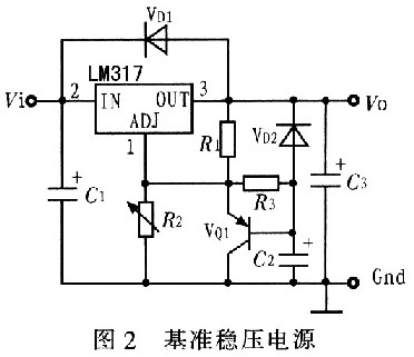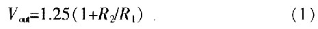 LM317是美國(guó)國(guó)家半導(dǎo)體公司的三端可調(diào)正穩(wěn)壓器集成電路,輸出電壓范圍是1.2~37 V,負(fù)載電流最大為1.5 A,使用簡(jiǎn)單。其工作過程如下:輸出電壓Vout通過R1、VQ1,對(duì)C2充電,開始時(shí)VQ1飽和導(dǎo)通,Vout最低(約1.5 V)。隨著C2上電壓的升高,VQ1逐漸退出飽和并趨于截止,Vout逐漸升高至額定電壓。改變R1、C2的常數(shù)可改變軟啟動(dòng)的時(shí)間。改變可變電阻R2的值,可調(diào)整輸出電壓Vout的值。VD1用于關(guān)機(jī)后使C2上的電荷快速泄放。其輸出電壓為: