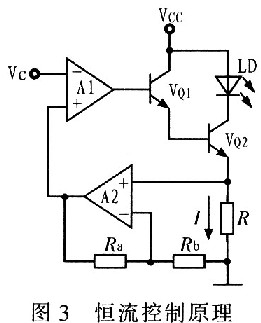 為了實(shí)現(xiàn)高的電流穩(wěn)定度,驅(qū)動(dòng)電路大多采用負(fù)反饋的控制方法,恒流控制原理如圖3所示。穩(wěn)流電路由基準(zhǔn)電壓電路、電壓-電流轉(zhuǎn)換電路、恒流輸出電路和反饋電路組成。電路工作時(shí),基準(zhǔn)電壓經(jīng)過適當(dāng)放大后送入運(yùn)放A1的同相端,運(yùn)放A1控制VQ1基極電流的大小,從而獲得相應(yīng)的輸出電流,輸出電流在取樣電阻R上產(chǎn)生取樣電壓,該取樣電壓經(jīng)A2放大后作為反饋電壓反饋回電壓放大器A1的反相輸入端,并與同相輸入端的電壓進(jìn)行比較,對(duì)輸出電壓進(jìn)行調(diào)整,進(jìn)而對(duì)VQ1基極的輸出電流進(jìn)行調(diào)整,使整個(gè)閉環(huán)反饋系統(tǒng)處于動(dòng)態(tài)的平衡中,以達(dá)到穩(wěn)定輸出電流的目的。