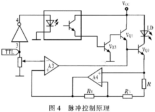 根據(jù)上述設(shè)計(jì)思想設(shè)計(jì)脈沖控制接口電路,其原理圖如圖4所示。由非門單元,晶體管VQ3,光電耦合器組成。當(dāng)脈沖為高電平時(shí),非門輸出低電壓,使光電耦合器截止,光電耦合器輸出低電平,使晶體管VQ3截止,VQ3集電極輸出高電平使VQ1、VQ2導(dǎo)通,LD正常工作;反之,光電耦合器導(dǎo)通,使VQ3導(dǎo)通,VQ3集電極輸出低電平,使VQl、VQ2截止,LD不工作。在沒有外控脈沖控制信號(hào)時(shí),接口懸空,非門輸入高電平,輸出低電壓,光電耦合器不工作,晶體管VQ3截止,VQ3集電極為高電平,使VQ1導(dǎo)通,保證LD的正常連續(xù)發(fā)光。