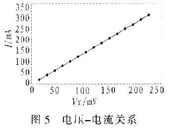 表1是該電路驅(qū)動(dòng)波長(zhǎng)650 nm,功率200 mW的LD連續(xù)工作時(shí),基準(zhǔn)電壓與輸出電流的測(cè)試結(jié)果,其電壓-電流關(guān)系如圖5所示。