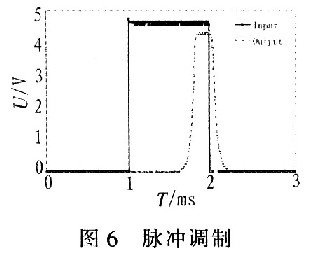 圖6顯示了該驅(qū)動(dòng)電源輸出的脈沖波形。曲線Input為輸入控制脈沖信號(hào),曲線Output為L(zhǎng)D上電壓脈沖。結(jié)果表明:LD上電壓脈沖的上升和下降時(shí)間都很短,中間段電壓的穩(wěn)定使輸出電流恒定,恒定的電流幅度保證了LD輸出功率的穩(wěn)定。通過改變輸入脈沖的頻率、脈寬,可得到所需的LD激光脈沖信號(hào)。