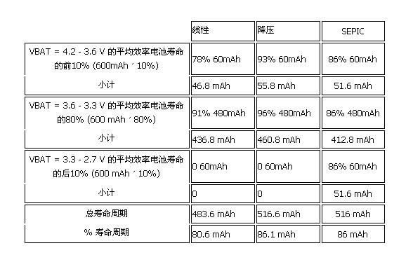 無論DSP 或模擬數(shù)字轉(zhuǎn)換器等數(shù)字零件,或是電源管理系統(tǒng)等模擬零件,2G 電話幾乎不提供任何的功能整合,系統(tǒng)設(shè)計(jì)人員在發(fā)展電源管理系統(tǒng)時(shí),通常會(huì)以成本和體積為優(yōu)先考慮,而不是轉(zhuǎn)換效率。線性穩(wěn)壓器只能將輸入電壓轉(zhuǎn)換成更低的輸出電壓,因此電池電壓必須高于3.3V,此時(shí)可利用低電流或中電流的線性穩(wěn)壓器進(jìn)行電壓轉(zhuǎn)換,以便提供電力給至2.8V 范圍內(nèi)的其它電源需求。在3G 芯片組中,基頻處理器現(xiàn)已包含DSP、微處理器/微控制器、模擬數(shù)字轉(zhuǎn)換器和數(shù)字模擬轉(zhuǎn)換器,用來控制射頻訊號(hào)和音頻訊號(hào)處理。這顆處理器的核心電壓已降至1.2V 或是更低,I/O 和外圍電壓也開始減少至2.5V 至3.0V 范圍;由于3.xG 電話的電流需求通常都超過2.G 電話,3.xG 設(shè)計(jì)人員需要效率高于線性穩(wěn)壓器的直流電源轉(zhuǎn)換器,以便提供更長的電池使用時(shí)間。為進(jìn)一步延長電池壽命,許多設(shè)計(jì)人員必須盡量利用鋰離子電池電力,直到其電壓降至 最小值為止;在此過程中,如何產(chǎn)生3.3V 電壓就變成一項(xiàng)挑戰(zhàn)。從表面上來看,設(shè)計(jì)人員若能繼續(xù)使用電池直到2.7V,并利用正電源降壓—升壓轉(zhuǎn)換器或是SEPIC 轉(zhuǎn)換器提供3.3V 電源,可攜式裝置的電池壽命就會(huì)大幅延長,但是根據(jù)(表一)針對(duì)600mAh 電池所做的簡(jiǎn)單分析可發(fā)現(xiàn)情形并非如此,因?yàn)闊o論是采用效率更高的降壓轉(zhuǎn)換器,并將電池使用到3.3V,或是采用SEPIC 之類的轉(zhuǎn)換器,并將電池電力完全用盡,這兩種方式的供電時(shí)間幾乎沒有任何區(qū)別。