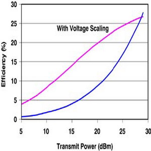 動(dòng)態(tài)/可適性電壓調(diào)整技術(shù)(DVS/AVS)與高整合度組件所使用的方式很類似,它會(huì)把閉回路系統(tǒng)中的處理器和穩(wěn)壓器連結(jié)在一起,并在確保系統(tǒng)正常工作的情形下,將數(shù)字電源供應(yīng)的輸出電壓動(dòng)態(tài)調(diào)整至最小值。功率放大器會(huì)被最佳化,使它在最大傳送功率下?lián)碛凶罡咝省S捎诮^大多數(shù)手機(jī)都在基地臺(tái)附近工作,手機(jī)的無線電功能會(huì)在維持通訊質(zhì)量的前題下,將傳送功率降至最低水平。當(dāng)功率放大器在較低的功率水平下工作時(shí),它的效率會(huì)受到影響,從(圖三)可以看出,利用動(dòng)態(tài)電壓調(diào)整技術(shù)來調(diào)整功率放大器的電壓,它的工作效率會(huì)增加10%至20%。