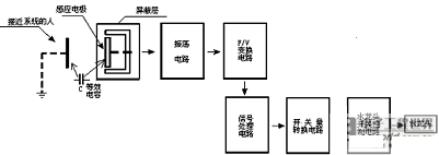 系統(tǒng)組成框圖如圖3所示,從框圖可以看出控制信號的流程:當(dāng)人或其它物體接近電容式接近開關(guān)時,等效電容的容量值會發(fā)生變化,從而改變LC振蕩器的振蕩頻率,F(xiàn)/V電路將LC振蕩器輸出的頻率量轉(zhuǎn)化成電壓量后,交給信號處理電路,該部分將電壓信號進(jìn)行一系列的處理(包括:放大、整形等)后傳給開關(guān)量變換電路,開關(guān)量轉(zhuǎn)換電路實(shí)際上是A/D轉(zhuǎn)換器,它將模擬電壓轉(zhuǎn)換為數(shù)字量,水龍頭控制電路由開關(guān)量轉(zhuǎn)換電路的輸出量控制,它產(chǎn)生控制信號控制水龍頭的開與關(guān)。本系統(tǒng)設(shè)計成當(dāng)人接近水龍頭一定距離時,水龍頭自動開啟,離開一定距離后水龍頭自動關(guān)閉。