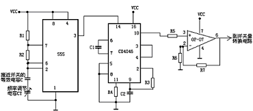 連線圖如圖4所示,由555定時器組成的振蕩器,它的振蕩頻率為:f=1/0.69*(R1+2*R2)*(C//CT),C就是電容式接近開關(guān)的等效電容值,CT為頻率調(diào)節(jié)電容,通過C的變化從而使振蕩頻率變化,將此種變化傳給F/V電路,引起F/V電路的輸出電壓變化。由鎖相環(huán)CD4046組成的F/V變換電路將頻率值變成電壓值后,經(jīng)精密運(yùn)放OP-07線性放大后輸入到開關(guān)量轉(zhuǎn)換器(A/D轉(zhuǎn)換器)的輸入端。