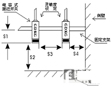安裝要求示意圖如圖5所示,圖中S1表示檢測面與支架的間距,要求≥1Sn,S2表示檢測面與背景的間距,要求≥3Sn,S3表示并列安裝間距,要求≥5Sn,S4表示檢測面與側(cè)壁的間距,要求≥3Sn。(Sn為電容式接近開關(guān)的標(biāo)準(zhǔn)檢測距離)