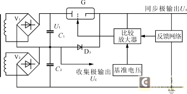 輸入400Hz/220V電源,經(jīng)高壓變壓器升壓變換后,輸出兩路交流高壓分別送入兩組整流器及濾波器,其中一組作為收集極電壓(Uc=15~18kV,Ic=85mA,而不需要專門做收集極高壓,這是該電路的獨(dú)特之處)送入行波管收集極。另外,將整流濾波后的兩組直流電壓串聯(lián),經(jīng)調(diào)整管G穩(wěn)壓后輸出穩(wěn)定度很高的直流電壓(UA=20~25kV,Ia≥15mA,穩(wěn)壓可調(diào))給行波管的同步極。在調(diào)整管G的陰極和兩整流器串聯(lián)點(diǎn)之間接一個(gè)高壓硅柱D3,對調(diào)整管G構(gòu)成過壓保護(hù)電路,調(diào)整管G出現(xiàn)的最高電壓就是整流器V1空載時(shí)的輸出電壓。所以調(diào)整管G可以選耐壓很低的管子。同時(shí)濾波電容C1、C2的耐壓也相應(yīng)降低了,因而大大減小了體積和重量。特別是消除了兩組電壓因充放電不一致引起高壓差而打火。