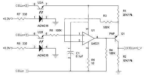 由于本文實(shí)驗(yàn)中采用的采樣電路參考電壓為2.5V,因此需要把電池電壓進(jìn)行2倍衰減,所以選擇了R1=2R2,電路中電容C1為去耦電容,電阻R5為限流電阻,電阻R4用于保證電路可靠工作,為了減少電壓檢測(cè)電路的漏電流,在每節(jié)單體電池電壓檢測(cè)線(xiàn)上加入AQW216光電繼電器作為檢測(cè)控制開(kāi)關(guān),如圖2所示,當(dāng)需要檢測(cè)電池電壓時(shí),通過(guò)控制端打開(kāi)光電繼電器,檢測(cè)完關(guān)閉光電繼電器,可有效減少檢測(cè)時(shí)的漏電流對(duì)電池組一致性的影響。