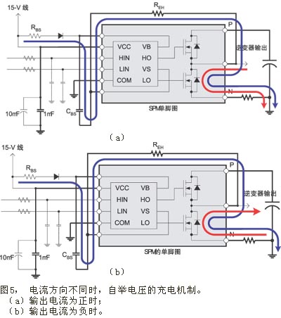 MOSFET逆變器的另一個(gè)優(yōu)點(diǎn)是圖4(e)所示的自舉電壓(陰極輸出電壓)。從圖4(e)可以看出,電機(jī)的工作頻率為10Hz。圖中畫(huà)出了自舉電壓和逆變器輸出電流。當(dāng)電流為正時(shí),自舉電壓VBS維持在VCC=15V附近,但當(dāng)電流為負(fù)時(shí),VBS就下降到接近10V。這是由于不同電流方向采用不同的充電機(jī)制所造成 (參見(jiàn)圖5)。當(dāng)輸出電流為正時(shí),電流要么流經(jīng)高壓側(cè)MOSFET,要么流經(jīng)低壓側(cè)體二極管。在這種情況下,當(dāng)?shù)蛪簜?cè)體二極管導(dǎo)通時(shí),將對(duì)自舉電容CBS充電 (參見(jiàn)圖5(a))。此時(shí),對(duì)CBS的充電電壓可由公式(2)表示。