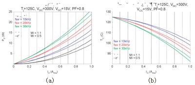 圖4給出了本模塊的一個(gè)應(yīng)用示例。在圖4(a)和(b) 的模擬中,假設(shè)結(jié)區(qū)溫度Tj保持為125℃;該溫度為本模塊的最大工作結(jié)區(qū)溫度。通過(guò)這項(xiàng)模擬,肯定當(dāng)模塊外殼溫度控制在100℃并采用空間向量調(diào)制 (SVPWM) 時(shí),輸出功率可大于Pout=100W,并允許Pd=16W的功率損耗。根據(jù)這些信息,我們利用一臺(tái)130W BLDC電機(jī)(正弦反電動(dòng)勢(shì)) 和圖4(c)所示的電路,對(duì)模塊的額定功率進(jìn)行驗(yàn)證實(shí)驗(yàn)。實(shí)驗(yàn)中采用的散熱片有效表面積約為100cm2。采用該散熱片后,模塊在20kHz SVPWM下可向電機(jī)輸出150W的功率;熱功耗為12W。而此時(shí)模塊的外殼溫度為86℃,MOSFET結(jié)區(qū)溫度為104℃,環(huán)境溫度27℃。在同樣條件下采用圖4(d)所示的非連續(xù)PWM時(shí),由于有效開(kāi)關(guān)頻率降低,模塊的功耗可達(dá)到8W,而逆變器效率可達(dá)到95%。此時(shí),模塊的外殼溫度為62℃,結(jié)區(qū)溫度為82℃(已考慮電機(jī)鐵芯的損耗),逆變器的損耗為整個(gè)系統(tǒng)功耗的27%