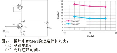 MOSFET的另一個(gè)優(yōu)勢(shì)是其耐用強(qiáng)度。它比IGBT的耐用強(qiáng)度高;與額定功率相同的其它器件相比,具有更寬的安全運(yùn)行區(qū) (SOA)。本文所介紹逆變模塊中的MOSFET在典型的運(yùn)行條件 (Vcc=15V, Vdc="300V", Tc="25"℃) 下,都能承受80ms的短路電流 (見(jiàn)圖2)。而且,在出現(xiàn)電涌時(shí),基于MOSFET逆變器的抵御能力優(yōu)于額定電壓相同的IGBT方案,這已被開(kāi)關(guān)器件的雪崩額定電壓值所證實(shí)。因此,在220V下可采用額定電壓為500V的MOSFET,而在相同條件下采用IGBT,其額定電壓則需要達(dá)到600V。但是,傳統(tǒng)的MOSFET開(kāi)關(guān)速度極高。MOSFET通常用于快速開(kāi)關(guān)轉(zhuǎn)換器,如AC/DC或DC/DC電源,這些應(yīng)用場(chǎng)合要求柵極電荷Qg盡可能少,以降低開(kāi)關(guān)損耗。不過(guò),在電機(jī)驅(qū)動(dòng)應(yīng)用中,這種快速特性沒(méi)有用處,尤其是高的dV/dt值還會(huì)引起電磁干擾。穩(wěn)定性與最佳性能不易兼顧.