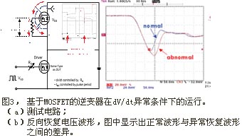通常,增加?xùn)艠O阻抗會(huì)降低MOSFET的開(kāi)關(guān)速度。在如圖3(a)所示的半橋電路中,如果高壓側(cè)MOSFET的柵極阻抗 (在HVIC中實(shí)現(xiàn)) 大,將會(huì)存在一定的短路電流;這個(gè)電流是上面那個(gè)MOSFET導(dǎo)通時(shí)的密勒電容Cgd感應(yīng)產(chǎn)生的,不嚴(yán)重時(shí)一般不會(huì)察覺(jué)。但是,正如圖3(b)所示,這種異常行為會(huì)增加逆變開(kāi)關(guān)的損耗 (導(dǎo)通損耗),并最終減弱系統(tǒng)的額定功率和穩(wěn)定性。在這樣的瞬態(tài)過(guò)程中,要降低開(kāi)關(guān)速度,同時(shí)又不失穩(wěn)定性,上方那個(gè)MOSFET的Vgs應(yīng)小于閾值電壓Vth。換句話說(shuō),最好通過(guò)調(diào)節(jié)HVIC的關(guān)斷阻抗來(lái)保證系統(tǒng)的穩(wěn)定性,防止因電壓變化而感應(yīng)短路電流。但這會(huì)增加MOSFET的關(guān)斷dV/dt值。