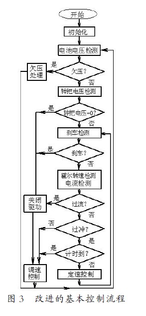 根據(jù)上述思路將軟件控制流程進行修改。如圖3 所示。將“速度增大而電流不增”作為“過沖”的判斷依據(jù)。控制器持續(xù)檢測速度變化和電流變化,再經(jīng)過判斷,如果不屬于“過沖”的情況,則執(zhí)行子程序“調(diào)速控制”。這種情況下控制器檢測轉(zhuǎn)把電壓值來調(diào)整PWM,增大或減小電流值使速度變化直至達到操作者通過轉(zhuǎn)把設(shè)定的速度值。