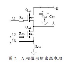 3)直流無刷電機的驅(qū)動控制:參見圖1,此電路采用三相無刷直流電機。3 個霍爾位置傳感器的空間間距為120o,輸出信號a、b、c最終送給單片機作為轉(zhuǎn)子位置檢測信號及測速信號。其中A 相末級電路如圖2 所示,在驅(qū)動電路中設(shè)置了電流檢測。單片機根據(jù)霍爾轉(zhuǎn)速信號和電流檢測信號,經(jīng)過分析判斷,輸出正確的PWM 控制信號給相應的線圈通電,從而控制電動機的起動、停止及轉(zhuǎn)速等。
