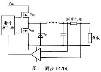 Vin為輸入電壓,VM1、VM2為MOSFET,VM1導(dǎo)通寬度決定輸出電壓大小,快恢復(fù)二極管和VM2共同續(xù)流電路,整流管的導(dǎo)通損耗占據(jù)最主要的部分,因此它的選擇至關(guān)重要,試驗(yàn)中選用通態(tài)電阻很低的M0SFET。電感、電容組成濾波電路。測量電阻兩端電壓與給定值比較后,通過脈沖發(fā)生器產(chǎn)生相應(yīng)的脈寬,保持負(fù)載電流穩(wěn)定。VM1關(guān)斷,快恢復(fù)二極管工作,快恢復(fù)二極管通態(tài)損耗大,VM2接著開通續(xù)流,減少系統(tǒng)損耗。